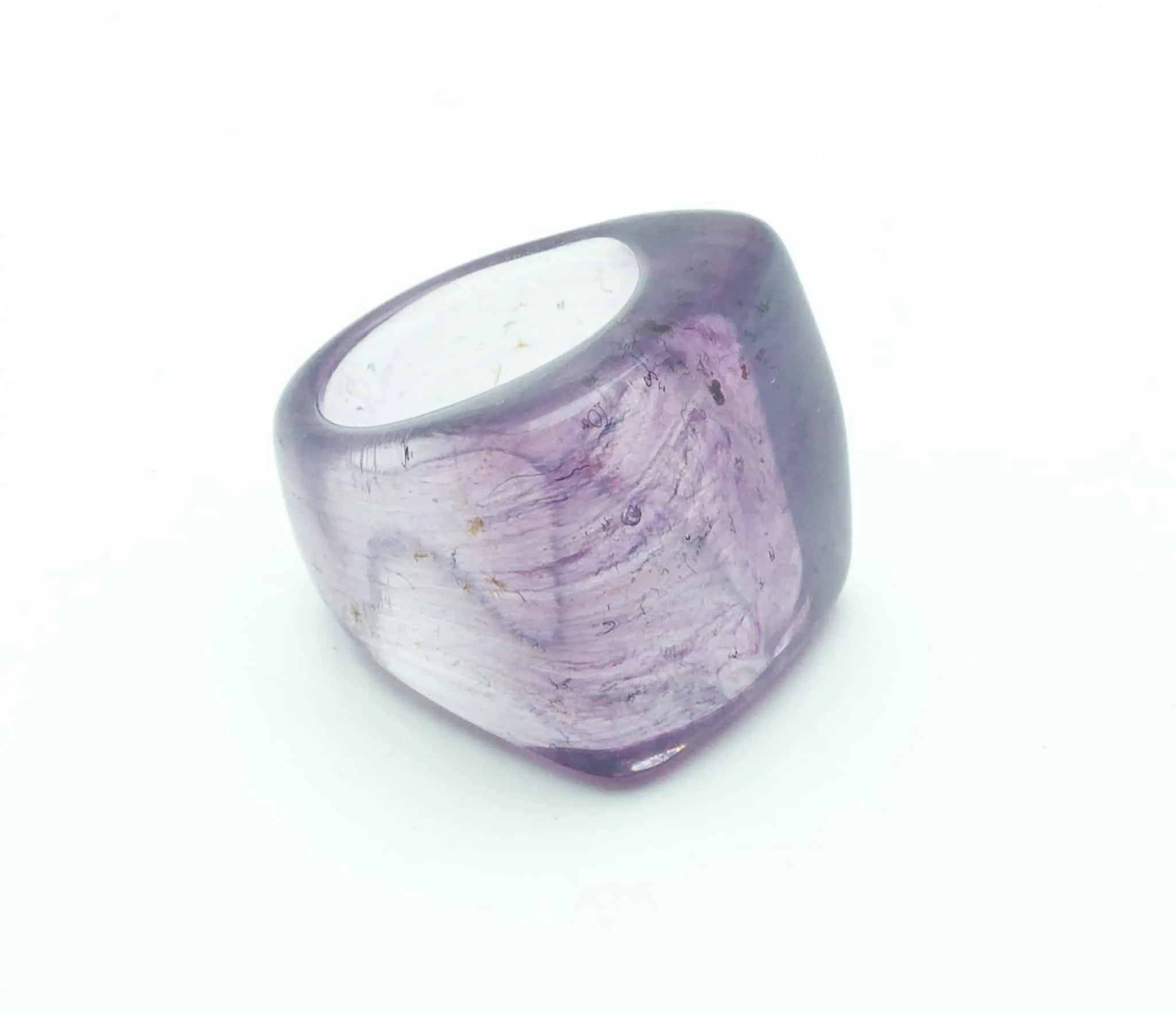 Très belle bague en résine mauve des années 90, prototype de bijou de couture. Non signée, juste unique !