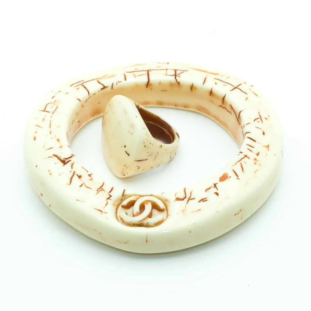 Très beau et rare bracelet Chanel, inspiration tribale, résine ivoire, brunie, c.2000. La bague n’est plus disponible.