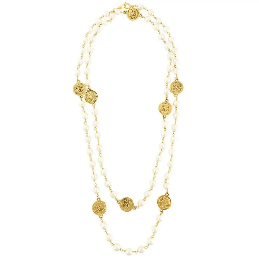Simulated pearls and gold tone coins with the Chanel logo in one side and the Coco Chanel portrait in the other.