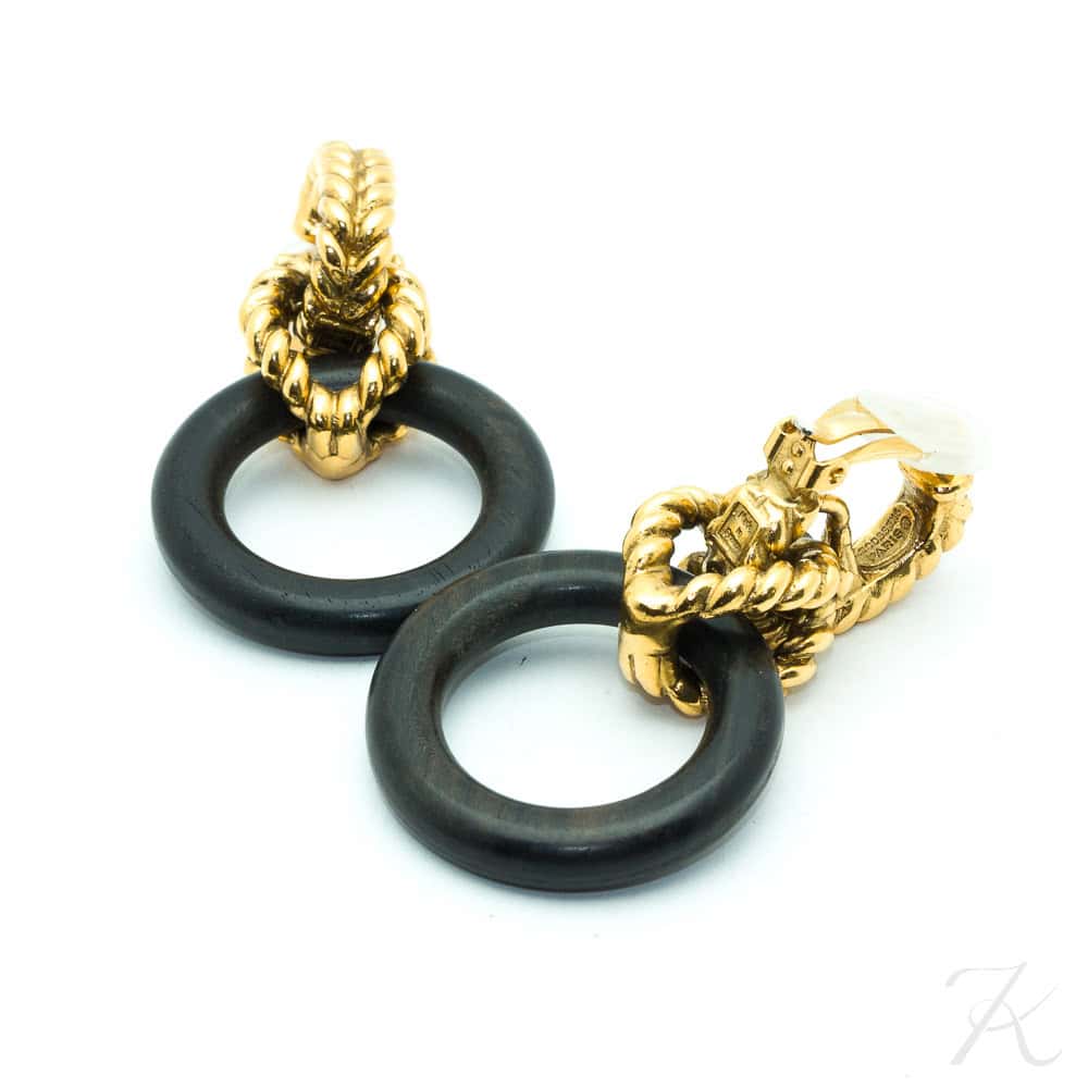 Incredible design and quality for this rare Robert Goossens vintage Ebony earrings of the 80s. 24 carats gold plated metal