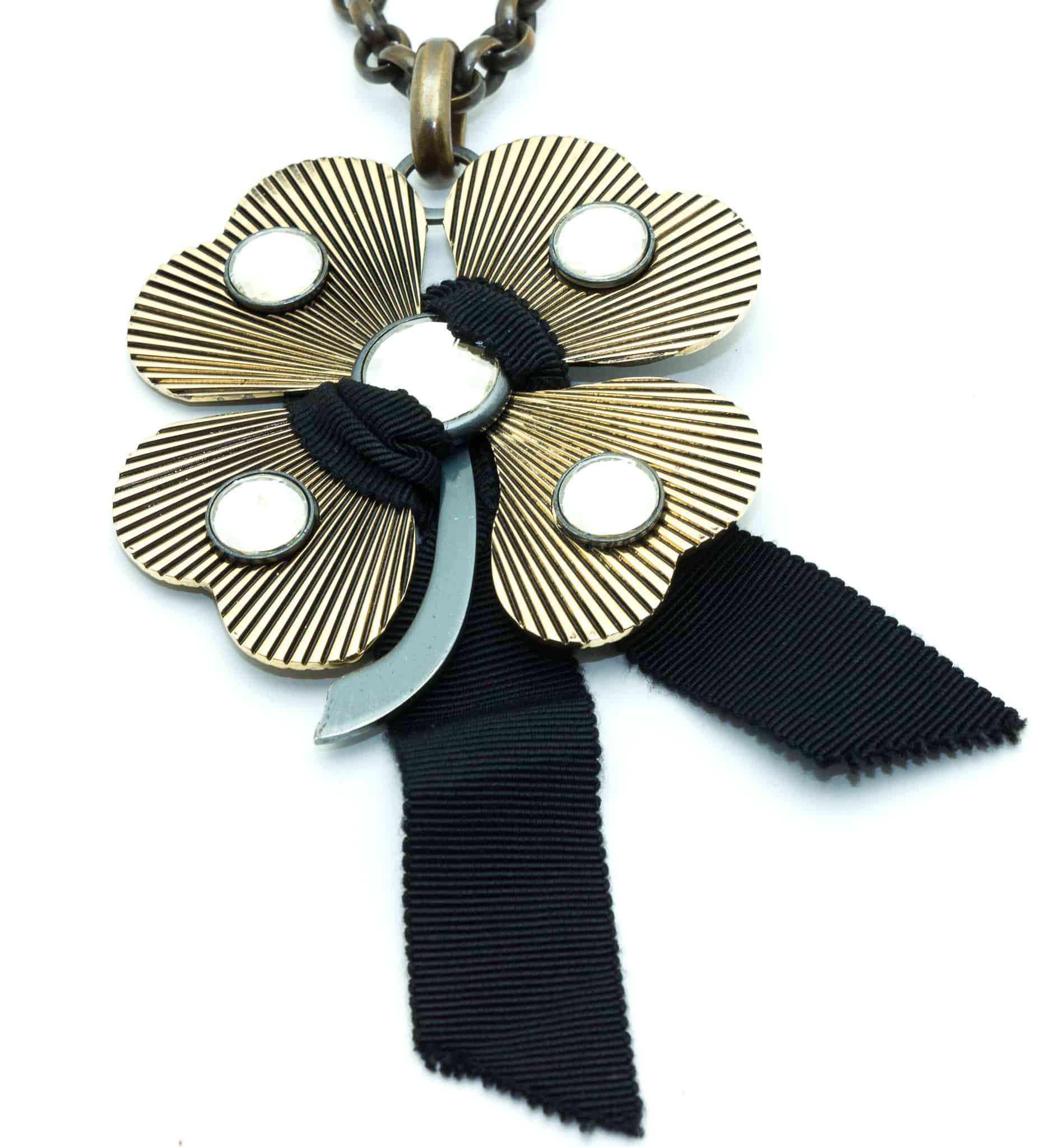 Superbe pendentif Lanvin trèfle,  métal et cristal, chaîne en métal noirci, c.2010.