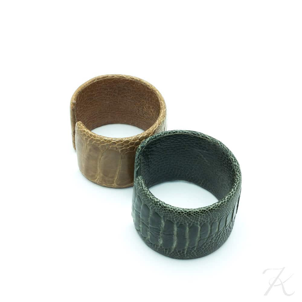Superbe qualité pour cette rare paire de manchettes vintage en cuir d’autruche. Excellent état. Dimensions – largeur : 3,8 cm Ouverture ajustable
