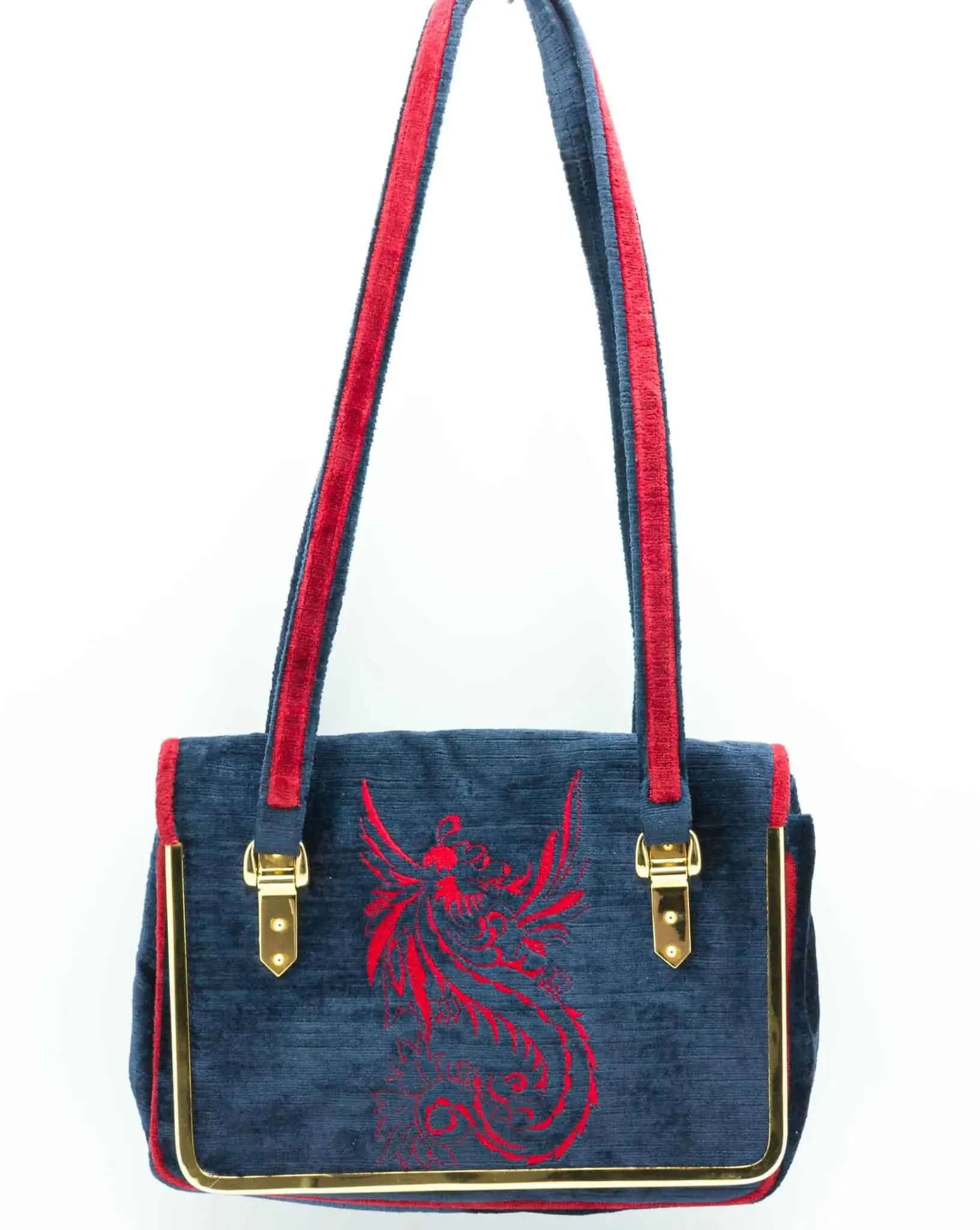 Superbe sac vintage fait en Italie et signé d’une enseigne belge des années 70. Très beau velours bleu marine et rouge, finitions en métal doré, se ferme par un rabat avec pression, intérieur en cuir et poche se fermant par une tirette.