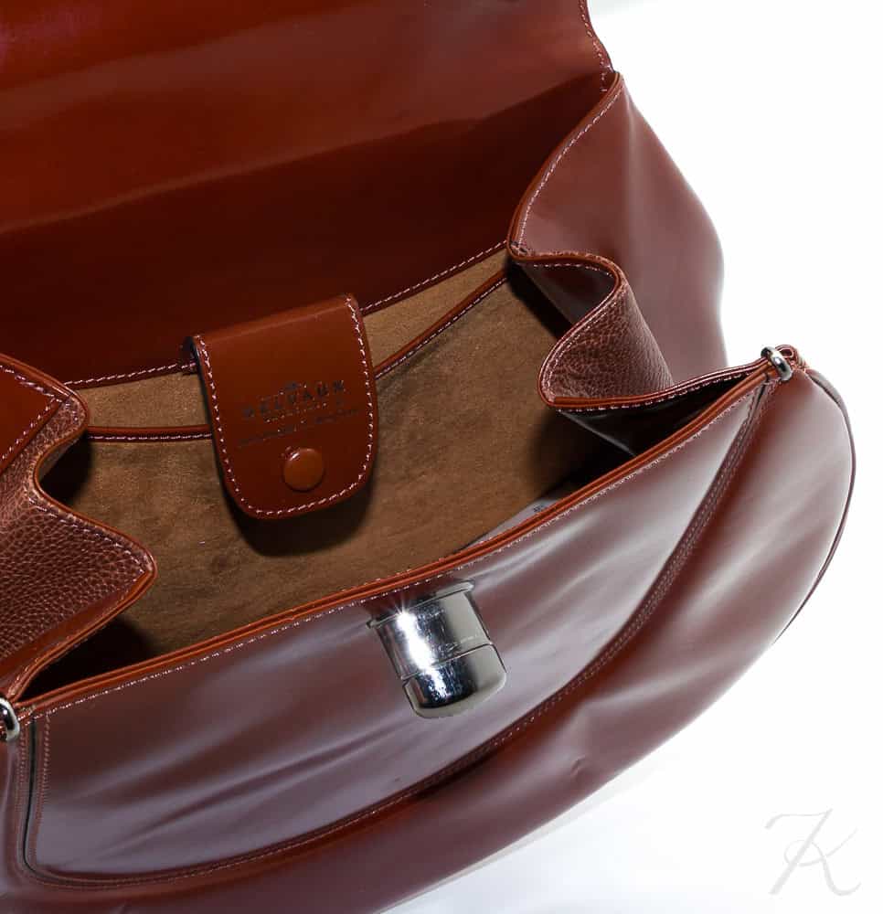 The Extase bag of Delvaux made of cognac varnished leather – c.1990. Founded in Brussels in 1829, Delvaux is recognized as the oldest fine leather luxury goods house in the world and is the official purveyor to the Royal Court of Belgium.
