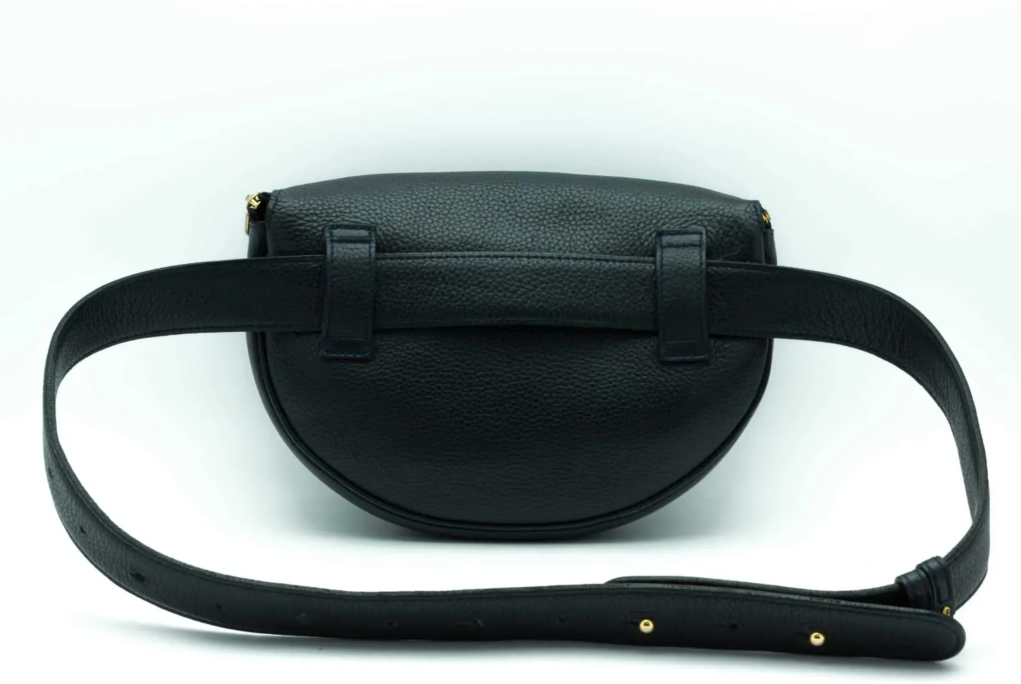Very practical, trendy & unusual to find! Delvaux Vintage belt handbag, navy blue leather, suede lining, gold metal hardware.