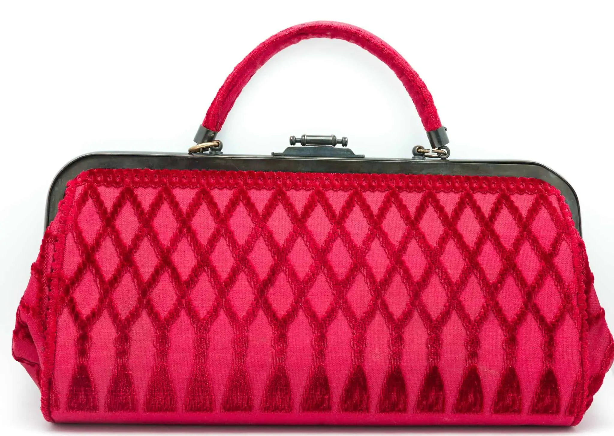 The form, the design and the beauty of this Roberta di Camerino of the 70s is just gorgeous !!! Made of fushia velvet, gun metal, red leather lining.