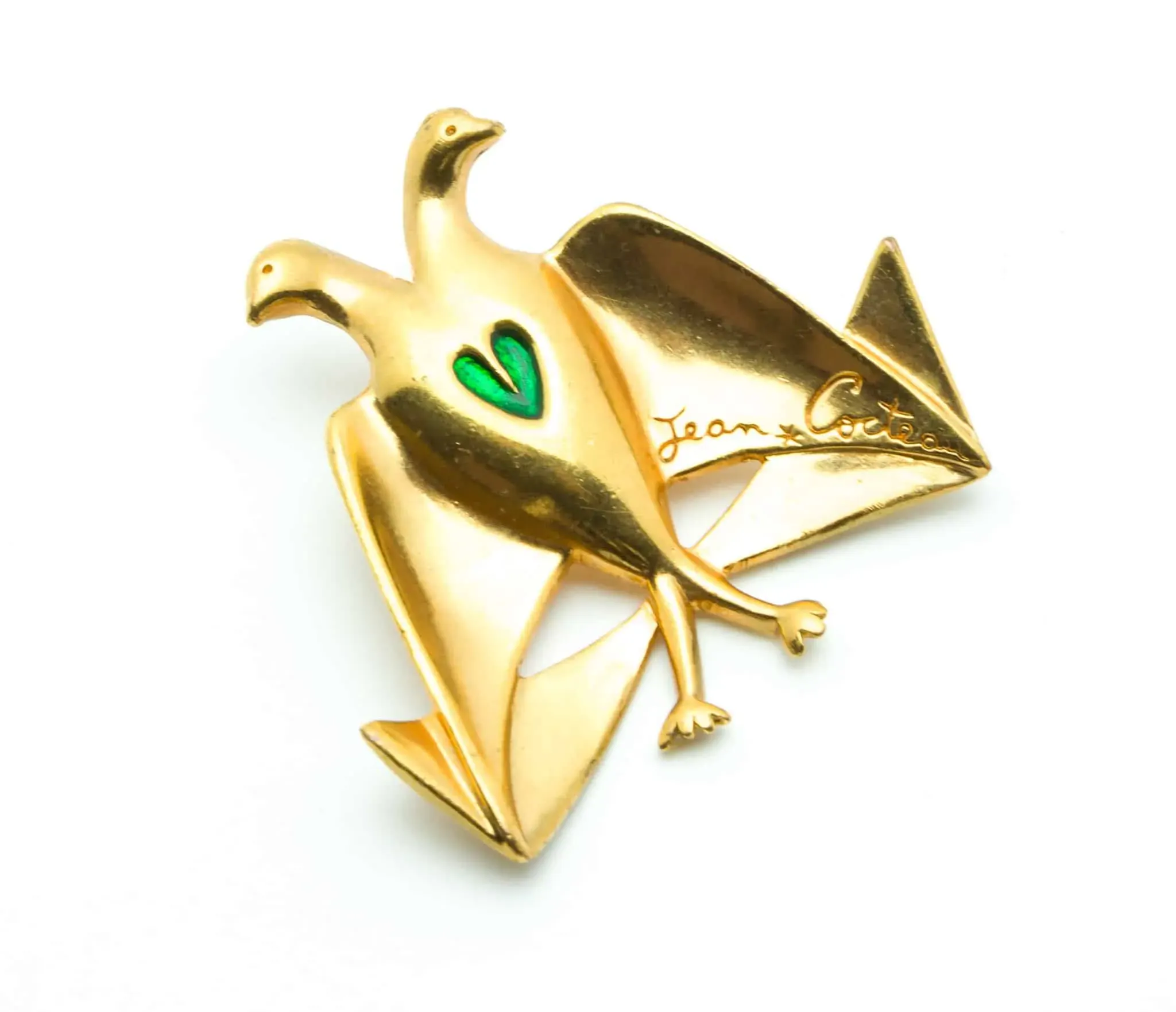 JEAN COCTEAU 1997 rare vintage eagle brooch collector: Surrealist eagle with 2 heads, gold plated metal and emerald color enamel