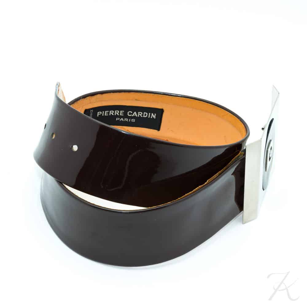 Gorgeous and rare Pierre Cardin collectable vintage belt, brown varnished leather and silver plated metal. Circa 1965.