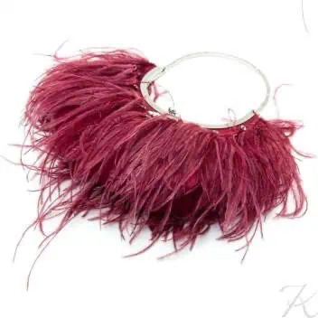 Spectacular evening bag by Scheilan, adorned with a sumptuous arrangement of burgundy ostrich feathers, enhanced with crystal-set details that bring brilliance and sophistication. The rigid frame and structured handle emphasize the couture character of this creation, conceived as a true jewel accessory.
